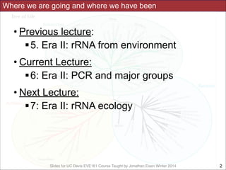This document contains lecture slides for a course on microbial phylogenomics taught by Jonathan Eisen at UC Davis in winter 2014. The slides discuss the use of rRNA PCR and sequencing to study major microbial groups based on 16S rRNA gene sequences. They provide phylogenetic trees comparing sequences from cultivated vs uncultivated microbes in various bacterial divisions. The slides also address issues with phylogenetic analysis like unseen changes over evolutionary time and limitations in representing diversity due to a lack of cultivated microbes. Overall, the slides aim to provide students with an understanding of how rRNA gene sequencing has expanded knowledge of microbial diversity beyond what was known from culture and the challenges that remain in fully resolving deep phylogenetic relationships.