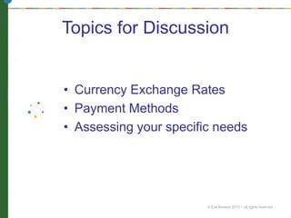 This document discusses various payment methods that can be leveraged to benefit a business, including currency exchange rates, payment processing options, and assessing specific needs. It provides an overview of different currency exchange considerations and payment processing options such as checks, direct deposit, wire transfers, PayPal, currency exchange services, prepaid debit cards, and credit cards. Key factors discussed include exchange rates, fees, processing times, currency control, and customizing a payment strategy based on client types, amounts, currencies, and terms. Resources for further information are also provided.
