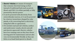 Electric vehicles are means of transport that use electrical energy instead of gasoline or diesel. They can be powered by electricity from an external source or from an onboard battery that is sometimes charged by solar panels. EVs include cars, trucks, buses, boats, trains and other vehicles. They have low operating costs since they require less maintenance than gas vehicles and are more environmentally friendly by producing no tailpipe emissions. Tesla has been a leader in the EV industry since launching its first luxury electric car in 2013. Countries are promoting EVs to reduce pollution and dependence on imported oil while cutting emissions that cause climate change. India has a goal of significantly increasing EV use by 2030 for environmental and economic reasons.