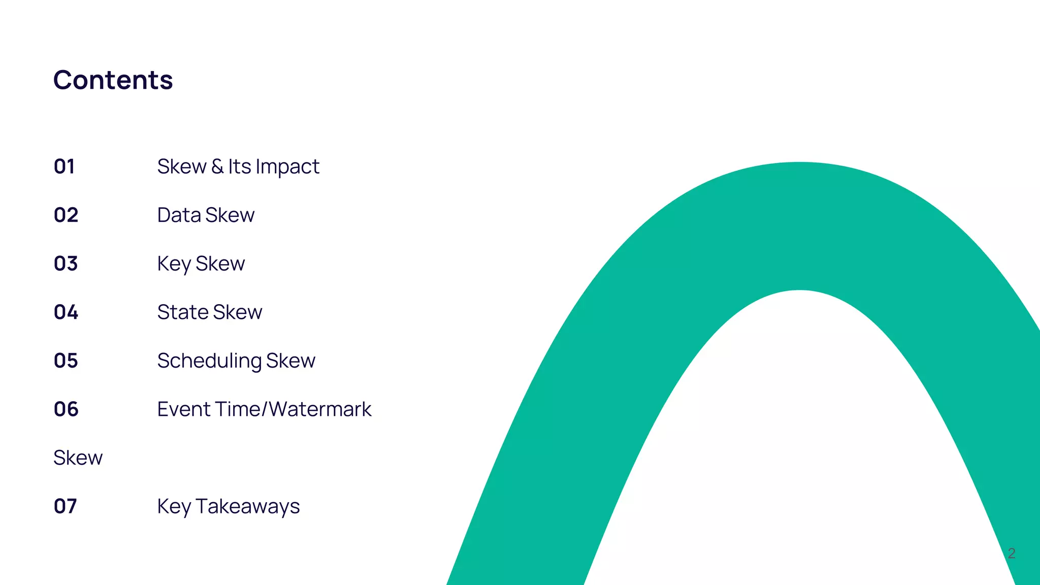The document discusses various types of skew in Apache Flink, including data skew, key skew, state skew, scheduling skew, and event time/watermark skew, highlighting their causes and impacts such as workload imbalance and low resource utilization. It presents strategies and solutions to mitigate these issues, including data repartitioning, using custom operators, and adjusting parallelism settings. Key takeaways emphasize understanding and addressing skew for improved streaming performance.