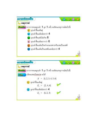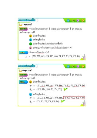 3 คน จงหาเหตุการณ์ต่อไปนี้ 1. มีบุตรชายอย่างน้อย 2 คน 2. บุตรคนที่สองเป็นหญิง วิธีทา กาหนดให้ ช แทนบุตรเป็นชาย ญ แทนบุตรเป็นหญิง S = {ชชช, ชชญ, ชญช, ญชช, ญญช, ญชญ, ชญญ, ญญญ} 1. ให้ E1 แทนเหตุการณ์ที่ครอบครัวนี้มีบุตรชายอย่างน้อย 2 คน E1 = { ชชช, ชชญ, ชญช, ญชช} 2. ให้ E2 แทนเหตุการณ์ที่ครอบครัวนี้มีบุตรคนที่สองเป็นหญิง E2 = {ชญช, ญญช, ชญญ, ญญญ} ตัวอย่างที่ 3 ในการโยนลูกเต๋าสองลูกพร้อมกัน 1 ครั้ง จงหาเหตุการณ์ 1. ลูกเต๋าขึ้นแต้มหน้าเหมือนกัน 2. ผลรวมแต้มลูกเต๋ามากกว่า 10 วิธีทา กาหนดให้ (x , y) แทนแต้มของลูกเต๋าลูกที่หนึ่งและลูกที่สองตามลาดับ แสดงผลลัพธ์ของการทดลองทอดลูกเต๋าสองลูกพร้อมกัน S={(1, 1), (1, 2), (1, 3), (1, 4), (1, 5), (1, 6), (2, 1), (2, 2), (2, 3), (2, 4), (2, 5), (2, 6), (3, 1), (3, 2), (3, 3), (3, 4), (3, 5), (3, 6), (4, 1), (4, 2), (4, 3), (4, 4), (4, 5), (4, 6), (5, 1), (5, 2), (5, 3), (5, 4), (5, 5), (5, 6), (6, 1), (6, 2), (6, 3), (6, 4), (6, 5), (6, 6)} 1. ให้ E1 แทนเหตุการณ์ลูกเต๋าขึ้นแต้มหน้าเหมือนกัน E1 = {(1,1), (2,2), (3,3), (4,4), (5,5), (6,6)} 2. ให้ E2 แทนเหตุการณ์ผลรวมแต้มลูกเต๋ามากกว่า 10 E2 = {(5,6), (6,5), (6,6)}