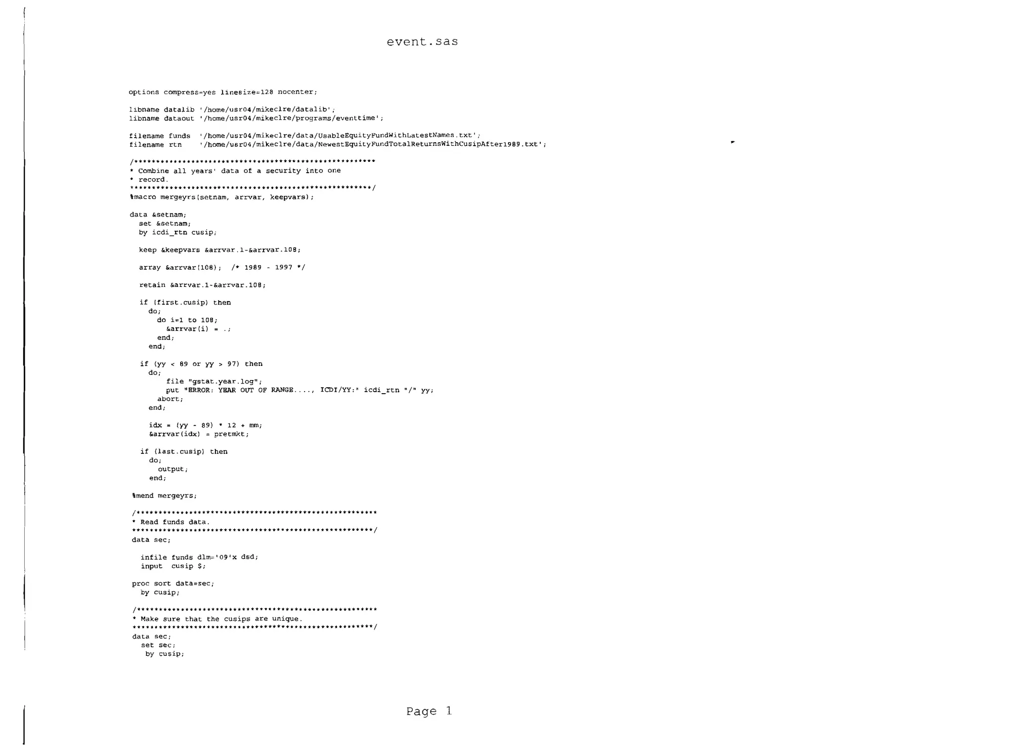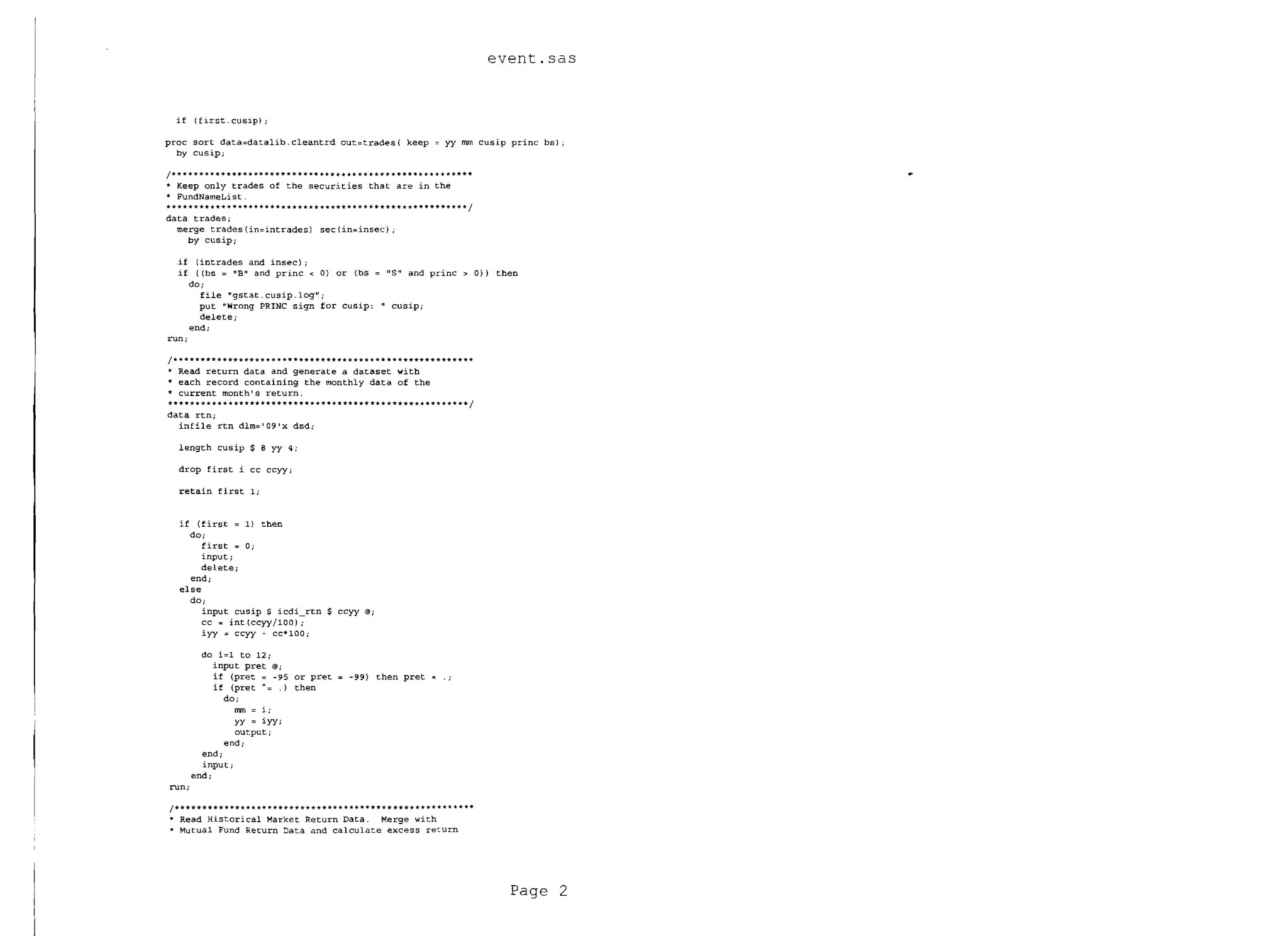 1. The document contains SAS code to analyze equity fund return data around buy and sell transactions.