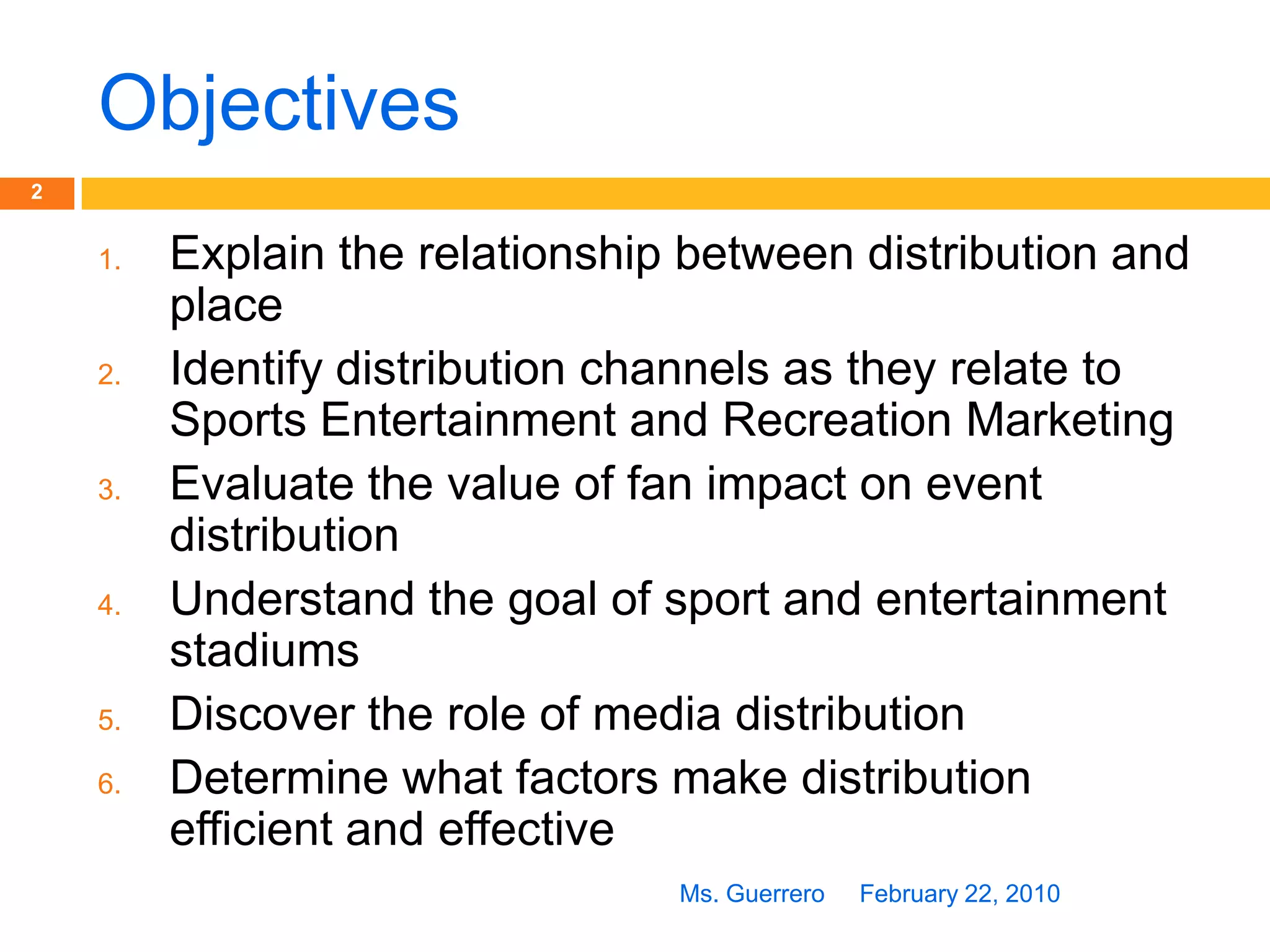 This document discusses event distribution for sports, entertainment, and recreation marketing. It identifies key objectives around understanding distribution channels and their relationship to fan impact. It evaluates different distribution methods like stadiums, media, and new technologies. Factors that make distribution effective like reaching mass audiences through media rights and deals are also examined. The goal is to create value for fans and attract more spectators through an improved experience at venues.