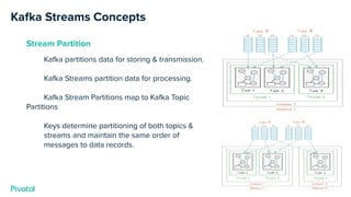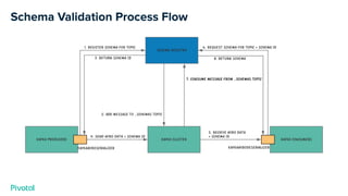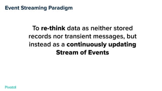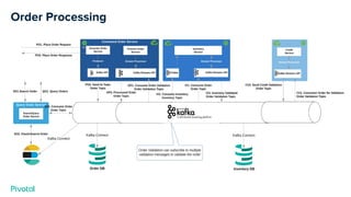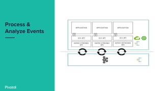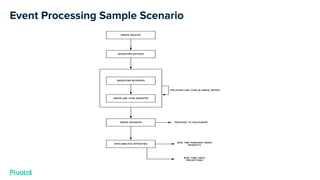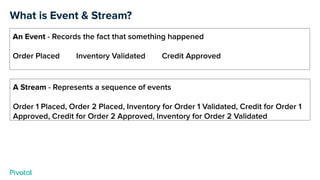 The document discusses the architecture and implementation of event-driven systems, particularly in the context of using Kafka for processing business transactions. It outlines a sample code structure for utilizing Kafka Streams to manipulate and analyze streaming data, including setting up stream configurations and using various Kafka capabilities. Additionally, it references resources and examples related to Spring Cloud Stream and event-driven design principles.