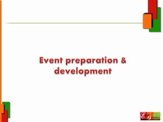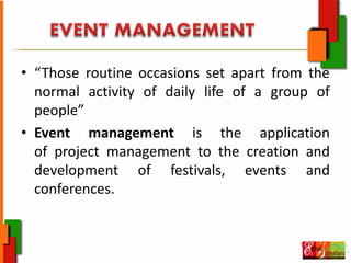 Event management involves planning, organizing, implementing and analyzing events such as festivals, conferences and exhibitions. It encompasses tasks such as identifying objectives and target audiences, handling logistics and vendor coordination, budgeting, marketing and ensuring post-event success. Professionals in this field wear many hats and require strong project management, client services, and problem-solving skills to navigate the intricacies of event planning and ensure events are delivered seamlessly. A thorough process including feasibility analysis, vendor selection, budgeting, marketing planning and post-event reviews is required.