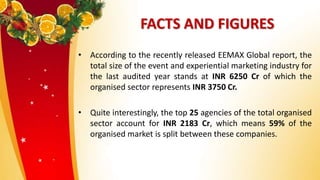 The event management and experiential marketing industry in India is projected to reach INR 10,000 crore by 2020-21, with a notable growth rate of 28-30%. Key strategies for starting an event management company include market research, a solid business plan, and understanding financial requirements. Various sources of financial assistance, including government grants and loans under the Pradhan Mantri Mudra Yojna, are available for entrepreneurs in this sector.