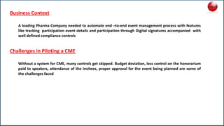 The Pharma company needed to automate their CME event management process to improve controls over budgets, speaker payments, and attendance tracking. Our solution provided a 7-step workflow to plan, approve, execute, and analyze events. It reduced manual errors, ensured compliance, and gave stakeholders quick access to analytics on events and participation compared to the previous manual system.