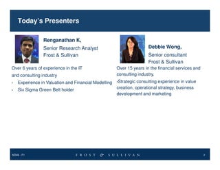 The document provides an analysis of the global event management software market from 2013 to 2016. It finds that the market was worth $28 billion in 2012 and is projected to grow at a 3.3% CAGR to $32 billion by 2016. The market is highly fragmented with over 300 companies and no player having more than 20% market share in the US. While companies have high gross margins, many suffer losses due to high spending on sales and marketing. The analysis finds that startups have better asset usage than mid-sized firms. It also provides valuation scenarios for entrepreneurs, finding higher potential returns for those able to obtain venture funding.