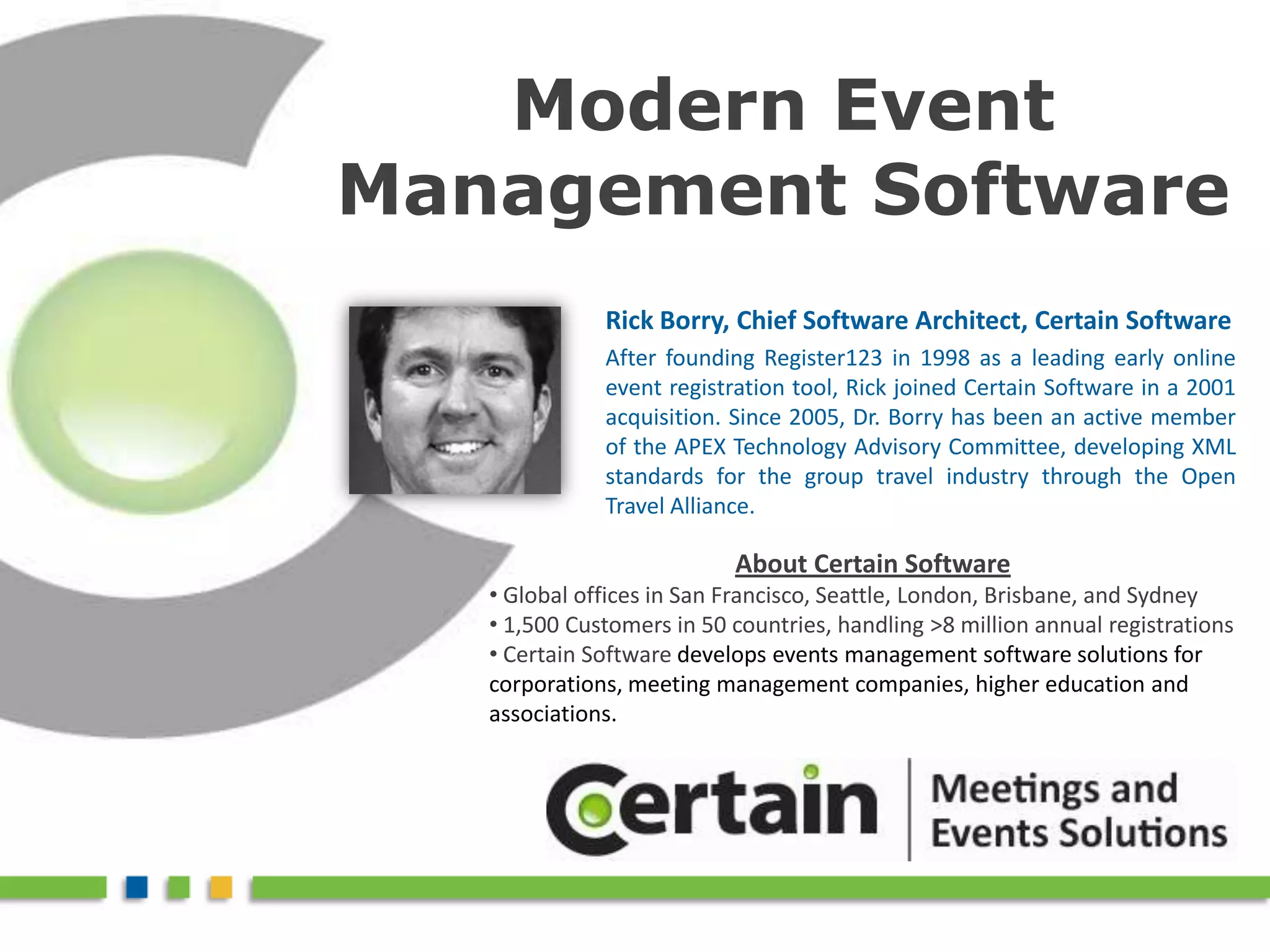 Modern Event Management Software provides an overview of Certain Software and its event management solutions. Certain Software develops event management software used by over 1,500 customers in 50 countries to handle over 8 million annual registrations. The document outlines the key features of Certain Software's event management platform, including configuring event databases, event marketing, online registration, housing and travel, budgets, location selection, reporting, and integration capabilities.