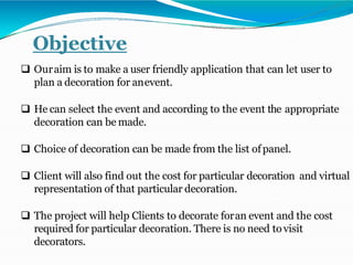 The document outlines an event management system aimed at providing a user-friendly application for planning event decorations, including cost estimation and virtual representations. It details the system's objectives, such as streamlining data management, enabling user registration, and allowing event managers to update records easily. The technology used includes Java, HTML, CSS, JavaScript, and MySQL, with several functional modules for user registration, event management, notifications, and administration.