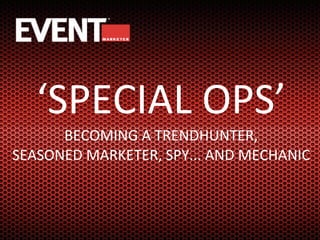 The document outlines a strategic marketing approach named 'special ops,' which blends traditional and digital tactics to achieve marketing goals in challenging environments. It highlights the roles of trend hunters, seasoned marketers, spies, and mechanics in launching new products, addressing issues such as operational challenges and market engagement. Specific campaigns mentioned include a product that aggregates user updates and efforts to promote solar energy, emphasizing the importance of adaptability and research in overcoming obstacles.