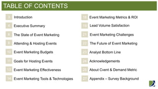 This document is a benchmark report on event marketing that was sponsored by Cvent and conducted by Demand Metric. The report provides an executive summary of its key findings from surveying primarily B2B and B2C marketers about their event marketing strategies and effectiveness. It finds that events are considered a medium to high priority investment, with the primary goals being customer engagement and demand/lead generation. More effective events with higher attendance and value for attendees lead to higher ROI and more leads. Measurement of event marketing metrics is important for satisfaction levels.