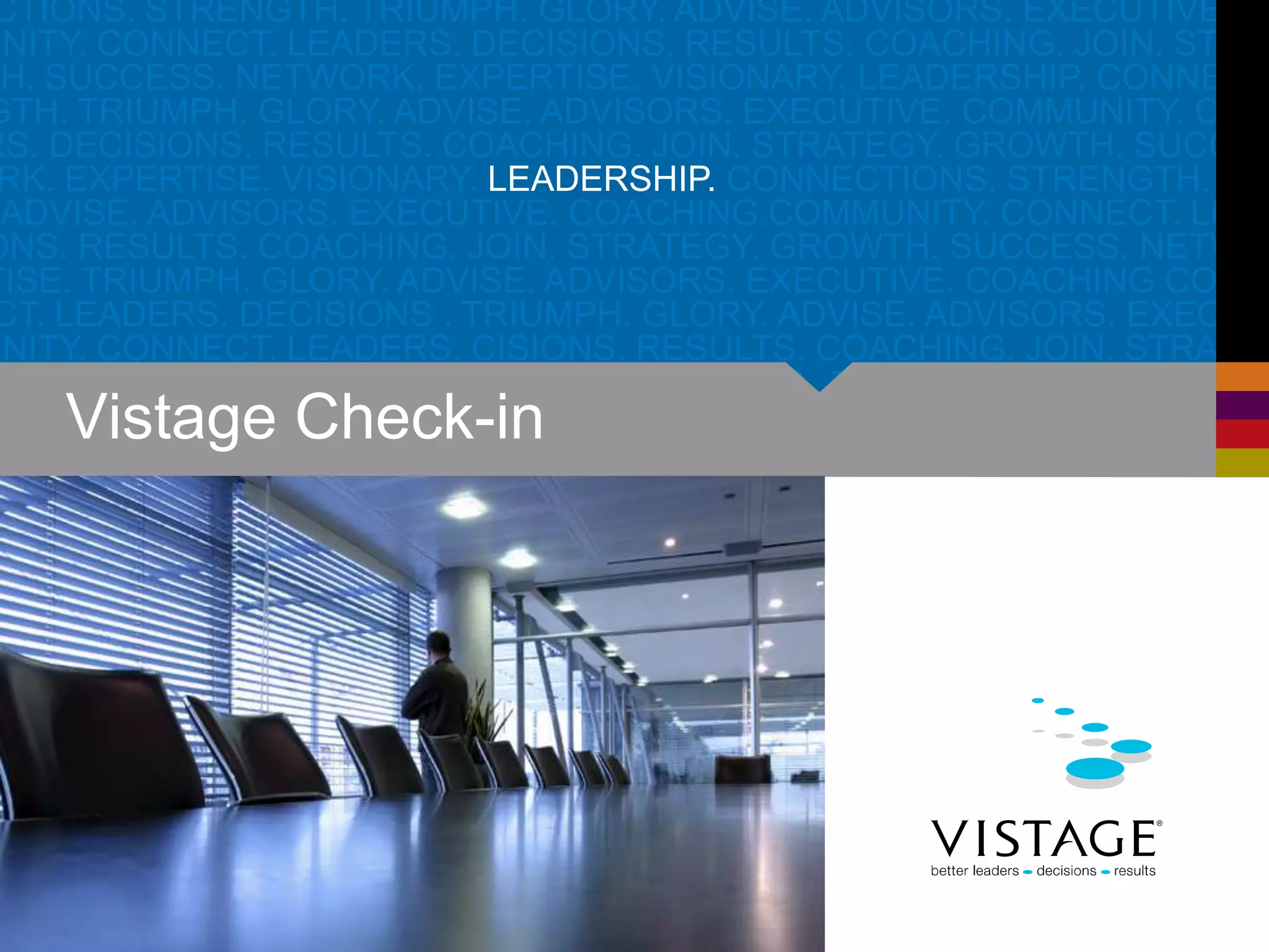 The document discusses various aspects of the Vistage executive coaching program, including group meetings, expert speakers, online resources, and one-on-one coaching sessions. The purpose of Vistage is to help business leaders improve their skills and make better decisions to achieve business success through networking, peer advice, and access to expertise.