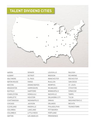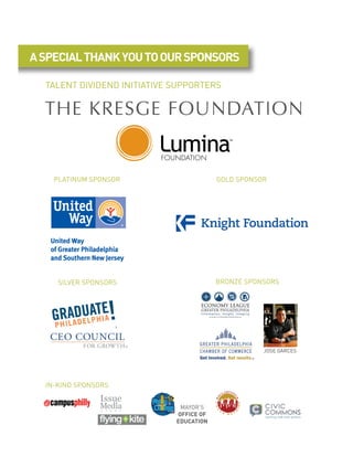 The document provides an agenda and details for the 2013 National Talent Dividend Network Convening held in Philadelphia on April 7-9, 2013. The convening brought together leaders from 57 cities involved in a $1 million Talent Dividend Prize competition to increase college attainment rates. The agenda included keynote speakers, panel discussions on building partnerships and supporting diverse student populations, and workshops on using data and sharing stories. The goal was for cities to learn from each other and address strategies to increase college attainment.