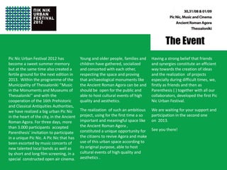 The document summarizes the Pic Nic Urban Festival that took place in Thessaloniki, Greece in 2012. Over three days, more than 3,000 participants gathered in the Ancient Roman Agora to enjoy music concerts, film screenings, and socialize in the historic space. The festival was a collaboration between the Municipality of Thessaloniki and 16th Ephorate of Antiquities. It aimed to revive the use of the Agora for cultural events and bring people together. The organizers believe the festival helped create ideas and projects, especially during difficult economic times, and they are looking forward to the next edition in 2013.