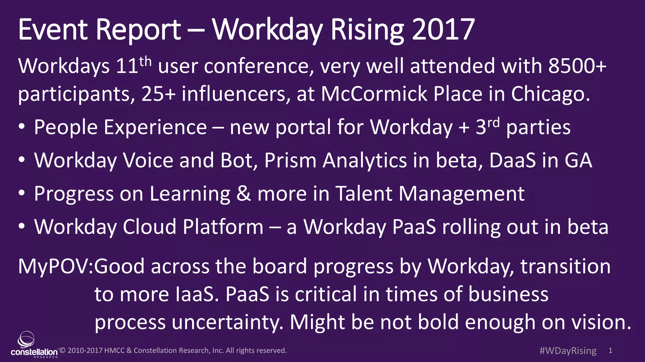 The Workday Rising 2017 event attracted over 8500 participants and featured discussions on new developments such as a portal for Workday and third parties, Workday Voice and Bot, as well as advances in talent management. The event highlighted progress on the Workday Cloud Platform, which is critical during business process uncertainties. Overall, there was a positive reception of Workday's advancements, though some suggest bolder vision is needed.
