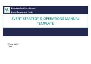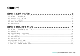 This document provides an event strategy and operations manual template for an event called [Your Event]. The document includes sections on event strategy, which outlines the event overview, vision, values, goals and objectives, activities, SWOT analysis, and competitor analysis. It also includes a section on operations, which provides details on the event timeline, finance, venue and logistics, program, marketing, risk management, and review/evaluation. The template aims to guide event organizers in strategically planning and operationally executing a successful event.