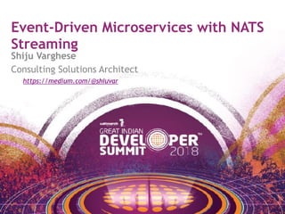 The document provides an overview of event-driven microservices architecture using NATS streaming, addressing practical challenges such as data management and distributed transactions. It introduces key concepts like event sourcing and the publish-subscribe messaging pattern. Additionally, it highlights the functionality of the NATS streaming server for building resilient microservices in cloud-native environments.