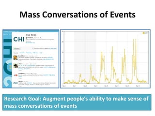 EventGraphs are network graphs that illustrate the social structure of discussions around events on social media. This document discusses EventGraphs, including how they are created in NodeXL and analyzed to understand the social structure and important discussants in event conversations. It provides examples of EventGraphs for conferences and discusses future work such as automated query expansion and integrating sentiment analysis.