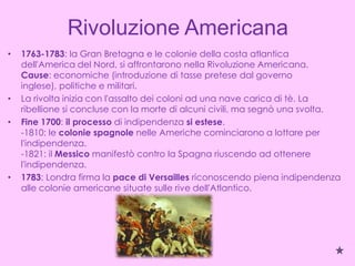 Il documento analizza eventi storici significativi dal 1750 al 1820, in particolare la rivoluzione americana e la rivoluzione francese. La rivoluzione americana (1763-1783) portò all'indipendenza delle colonie americane, mentre la rivoluzione francese (1789-1799) si concentrò sui diritti borghesi e sulla creazione di un governo costituzionale. L'età napoleonica (1800-1815), seguita dall'ascesa di Napoleone, fu caratterizzata da un mix di illuminismo e romanticismo nell'arte e nell'architettura.