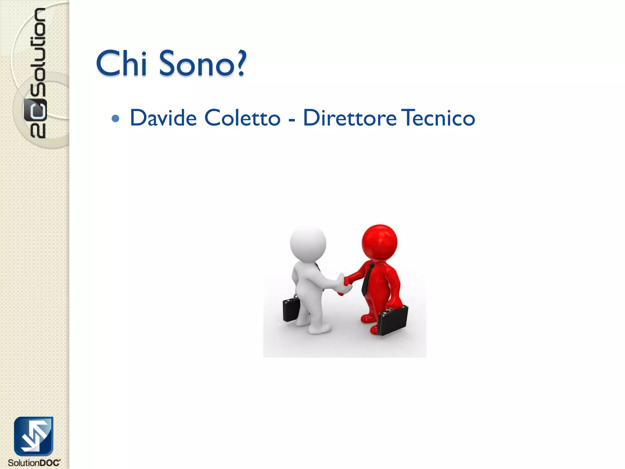 Davide Coletto è il direttore tecnico di 2c Solution Srl, che sviluppa la piattaforma SolutionDoc® per l'informatizzazione dei processi documentali. La società offre consulenza sulla dematerializzazione della carta e sulla conservazione sostitutiva, implementando soluzioni di cloud computing con vantaggi economici e tecnologici. Il servizio SolutionDoc è mirato a fornire alle PMI strumenti per la gestione della documentazione, ottimizzando così le risorse IT.