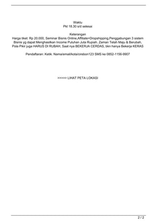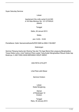 Seminar berjudul "Super Saturday Seminar" akan diselenggarakan pada tanggal 26 Januari 2013 di Apartement City Lofts Lantai 9 Unit 920, Jakarta. Seminar ini akan membahas peluang usaha dan tips agar bisnis cepat menghasilkan untuk merubah hidup peserta.