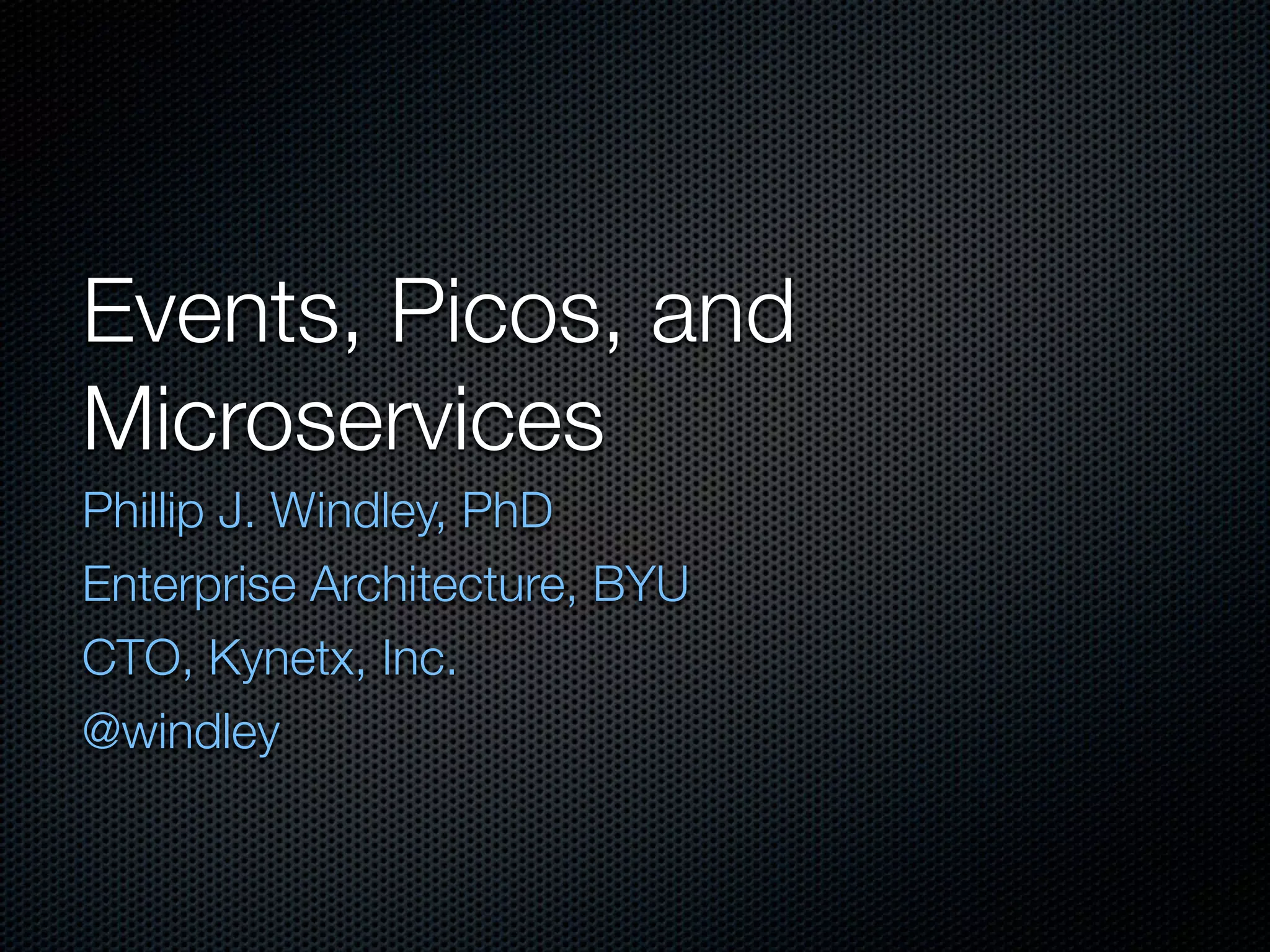 The document discusses the concept of 'picos', which are decentralized, networked online computers that encapsulate data and respond to events autonomously. It highlights the evolution from traditional API models to event-driven systems, emphasizing the need for more loosely coupled architectures in the Internet of Things. Furthermore, it delves into the organization of microservices around specific business capabilities and the advantages of event-driven asynchronous programming for enhanced scalability and modularity.