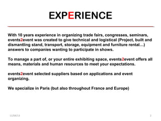 events2event is an event management company with 10 years of experience organizing trade fairs, congresses, and other events. They offer full event logistics support including stand design and construction, equipment rental, transportation, and staffing to allow clients to focus on their projects. Their personalized approach and quality suppliers help ensure customer satisfaction.