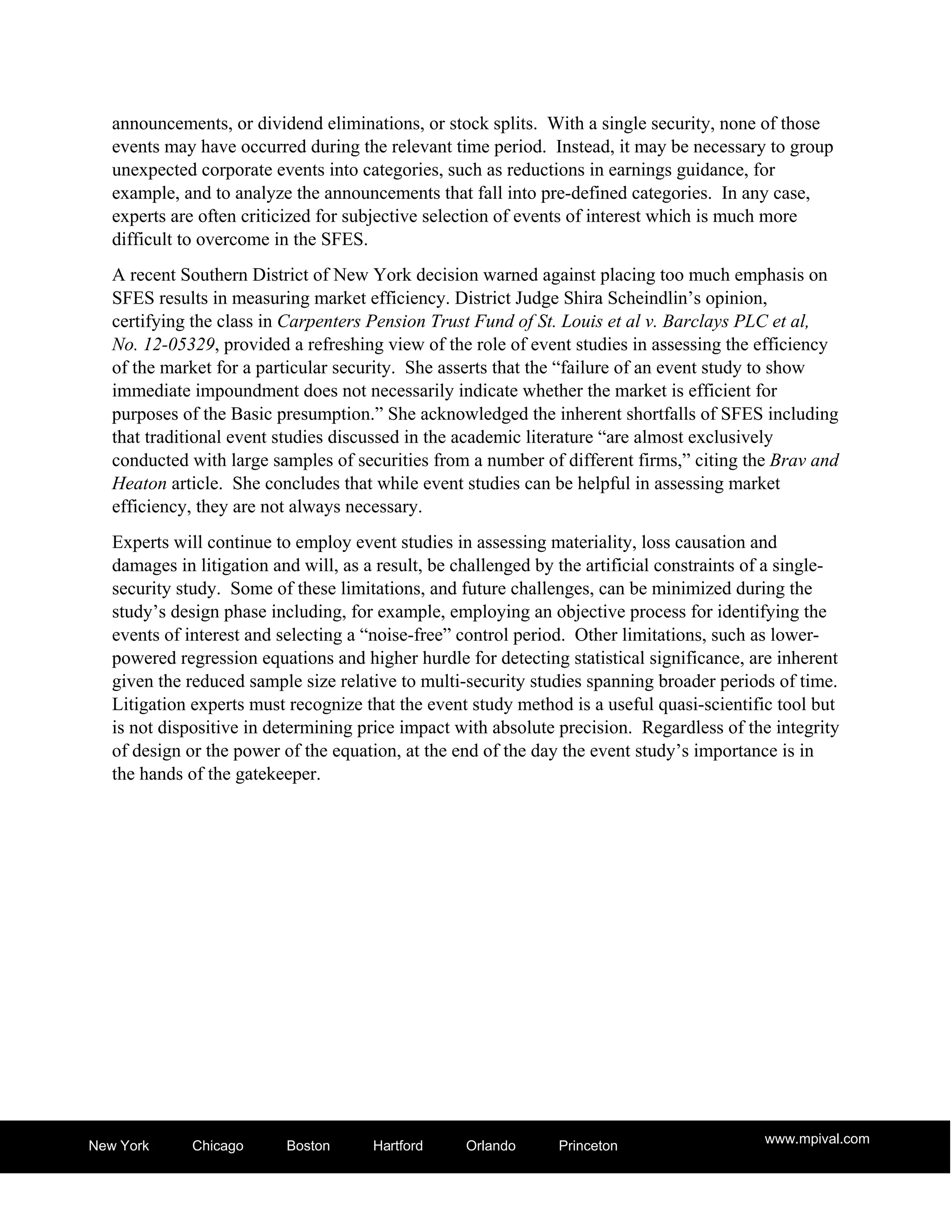 The article discusses some problems with using single-security event studies in securities litigation. Single-security event studies suffer from lower statistical power, an inability to account for confounding information, and upward bias in measuring price impact compared to event studies using multiple securities. The limited time period and number of events to analyze with a single security make the study design more vulnerable to criticism. While event studies can help assess market efficiency, courts should not over-rely on their results given limitations of the single-security approach. Experts must recognize event studies are a useful tool but not dispositive and are subject to the interpretation of the courts.
