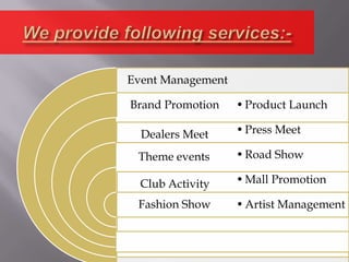 Eventum Marketing provides various marketing and event services to help businesses gain momentum. They are known for meticulously planning, visualizing, and producing events and campaigns on time and within budget. Their services include corporate events, brand promotions, parties, design work, and publicity. Some of their clients include Dish TV, Radio Mirchi, Godrej Interiors, TVS Scooty, Videocon, and Asian TT.