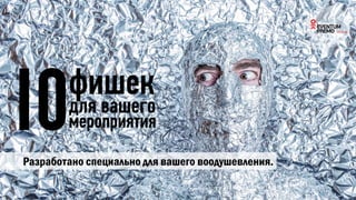 Документ представляет идеи для мероприятий от eventum premo, предлагая разнообразные уникальные аттракционы и активности, такие как ледовое шоу, музыкальный промо робот и интерактивные стены. Также упоминается использование кофе-принтера и возможности для гостей почувствовать себя DJ. Документ ориентирован на вдохновение и нестандартные подходы к организации событий.