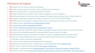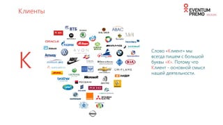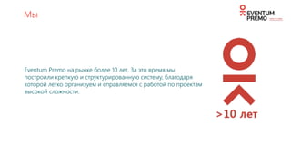 Агентство Eventum Premo работает на рынке 14 лет, предоставляя услуги по организации мероприятий и PR-сопровождению, а также разработке digital-кампаний для различных организаций. Оно гарантирует соблюдение европейских стандартов качества и предлагает широкий спектр услуг, включая таргетированную рекламу, SEO-продвижение и разработку веб-приложений. В документе также приведены успешные примеры работы с различными брендами, включая увеличение показателей вовлеченности и подписчиков в социальных сетях.
