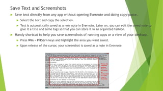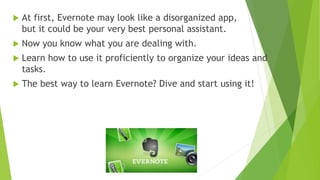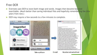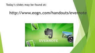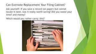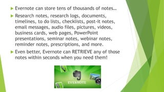 The document discusses how Evernote can help genealogists organize their research notes. Evernote allows users to store notes, documents, photos, web pages and other research materials in an easily searchable format across all devices. Key features include the ability to tag and organize notes in notebooks, sync notes across devices, and access materials offline. The document encourages genealogists to use Evernote to avoid disorganized files and lost research materials. It provides examples of how notes, documents and media can be stored and accessed from anywhere through the free Evernote app.