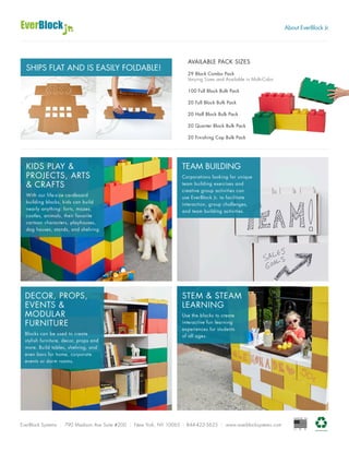 everblock® jr. is a versatile cardboard building block system that allows users to create various designs and structures limited only by their imagination. The blocks are eco-friendly, chemical-free, and require no tools for assembly, featuring a unique glue-less tab and fold system. Ideal for all ages, everblock jr. supports creativity in play, arts and crafts, and team-building activities.
