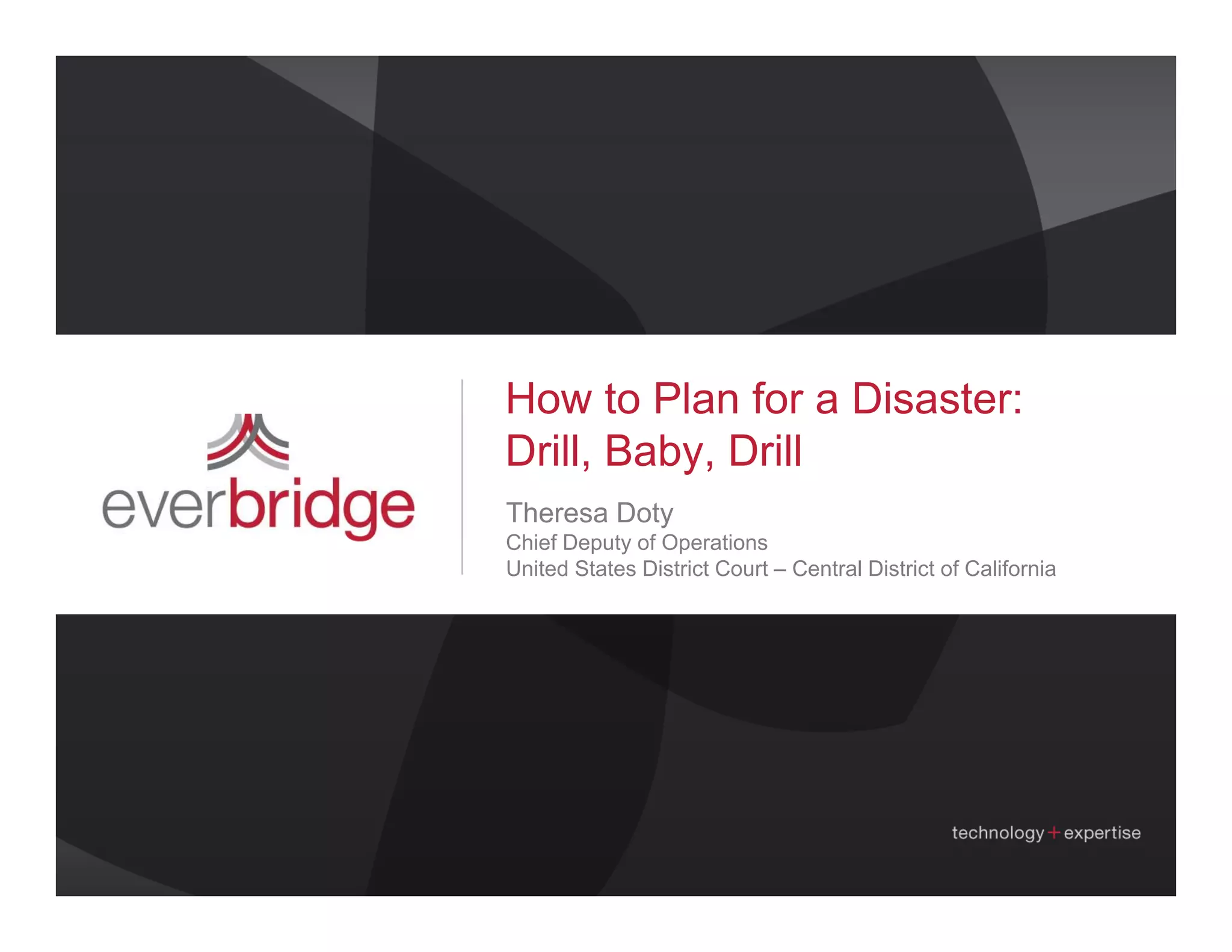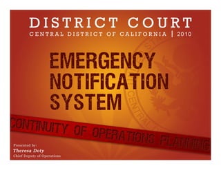 The document outlines disaster planning strategies and the role of Everbridge's notification systems for the Central District of California's federal court, which serves 18 million citizens. It emphasizes the importance of communication, feedback, and training in ensuring operational continuity during emergencies, while identifying potential risks such as fires, earthquakes, and pandemics. The summary includes key elements of the court's Continuity of Operations Plan (COOP) and how Everbridge enhances communication and response coordination among various stakeholders.