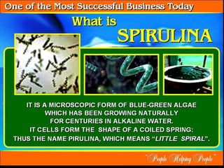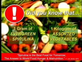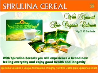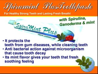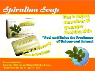 The document discusses various products and regimens involving spirulina extract and other natural ingredients for cleaning and health benefits. It highlights a biodegradable dishwashing liquid and a concentrated detergent that is gentle on hands, as well as specific dosage regimens for individuals with health conditions. Recommendations include the use of spirulina tablets and soaps for dietary and skin health purposes.