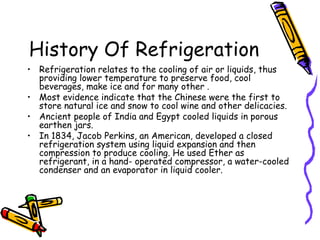 The document discusses the history and principles of refrigeration, including the evolution of refrigeration technologies and refrigerants, highlighting their environmental impacts, particularly related to ozone depletion and global warming. It details the Montreal Protocol's efforts to phase out ozone-depleting substances and the selection criteria for refrigerants based on thermodynamic properties, environmental safety, and cost. Additionally, it examines various refrigerant types including halocarbons, HCFCs, HFCs, and hydrocarbons, addressing their applications and regulations.
