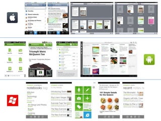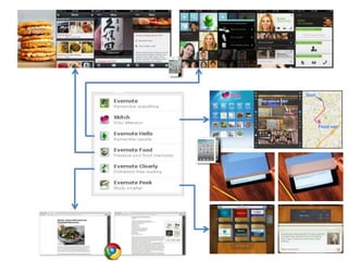 Evernote is a note-taking and organizing app that allows users to capture information from various sources, organize it into notebooks and tags, and access it from any device due to sync functionality. Users can capture information using their keyboard, camera, microphone, clipboard, or web clipper and can take notes, clip web pages, and store files and images. Evernote is available via native apps, web apps, and browser extensions. It offers both free and premium paid plans with additional storage and features for individuals and groups.