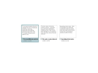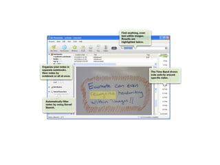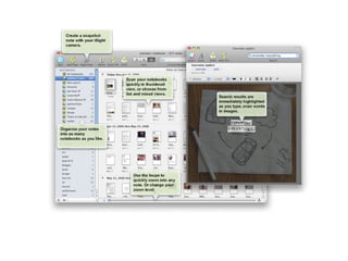 The document discusses John-Michael Oswalt's appreciation for note-taking and how different note-taking tools can enhance the process. It highlights various features such as syncing, searching, and incorporating images but also notes potential connectivity issues. Additionally, it includes a list of references to images and links that illustrate different note-taking methods and tools.