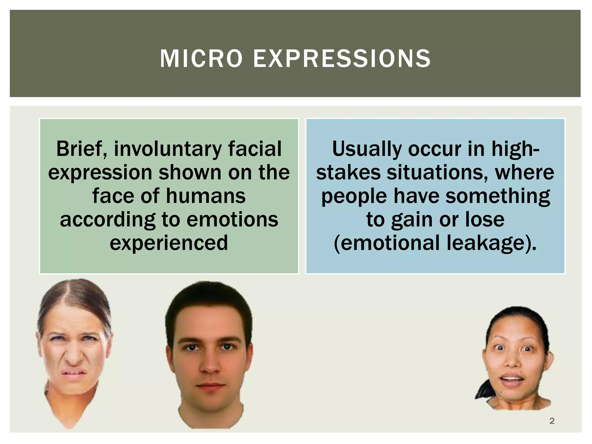This document discusses microexpressions and how to detect lies based on facial expressions and body language. It defines microexpressions as brief, involuntary facial expressions that last 1/15 to 1/25 of a second and occur in high-stakes situations. There are seven universal emotions that can be expressed in microexpressions - anger, disgust, happiness, surprise, fear, sadness, and contempt. The document claims that microexpressions and body language can reveal a person's true emotions and whether they are lying, as these expressions are difficult to fake. It provides examples of body language cues like fidgeting, rapid blinking, and inconsistent details that may indicate someone is lying.