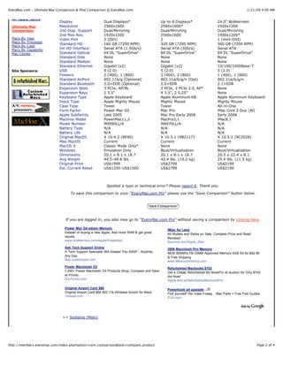 The document provides a side-by-side comparison of the specifications of three Apple Macintosh models: the Power Mac G5 2.0 (DC), Mac Pro 2.8 (2008), and iMac C2D 3.06 24 08. It lists detailed technical specifications such as processor, memory, storage, graphics, and other hardware specifications for each model. The comparison tool allows selecting different Mac models to view their specifications. Additional Mac specifications and details can be found on the EveryMac.com website.