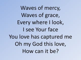 This song expresses devotion to Jesus, stating that every move, breath, and step is taken in him, and waves of mercy and grace are seen everywhere as God's love has captured the singer, who is amazed by this love. The singer takes in Jesus with every move, breath, and step taken, seeing God's face everywhere and being overwhelmed by God's love.