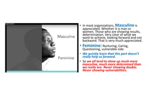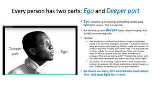 The document discusses how in most organizations, people are encouraged to suppress parts of themselves and only show their "ego" side. It notes that bringing up deeper issues or concerns, or showing vulnerability, caring, or questioning attitudes is discouraged and seen as risky. As a result, people only show a very narrow, rational, masculine, results-oriented side of themselves and suppress the other parts, only expressing 1/16 of their full selves. The document suggests teal organizations have found solutions to allow people to bring their whole selves to work.