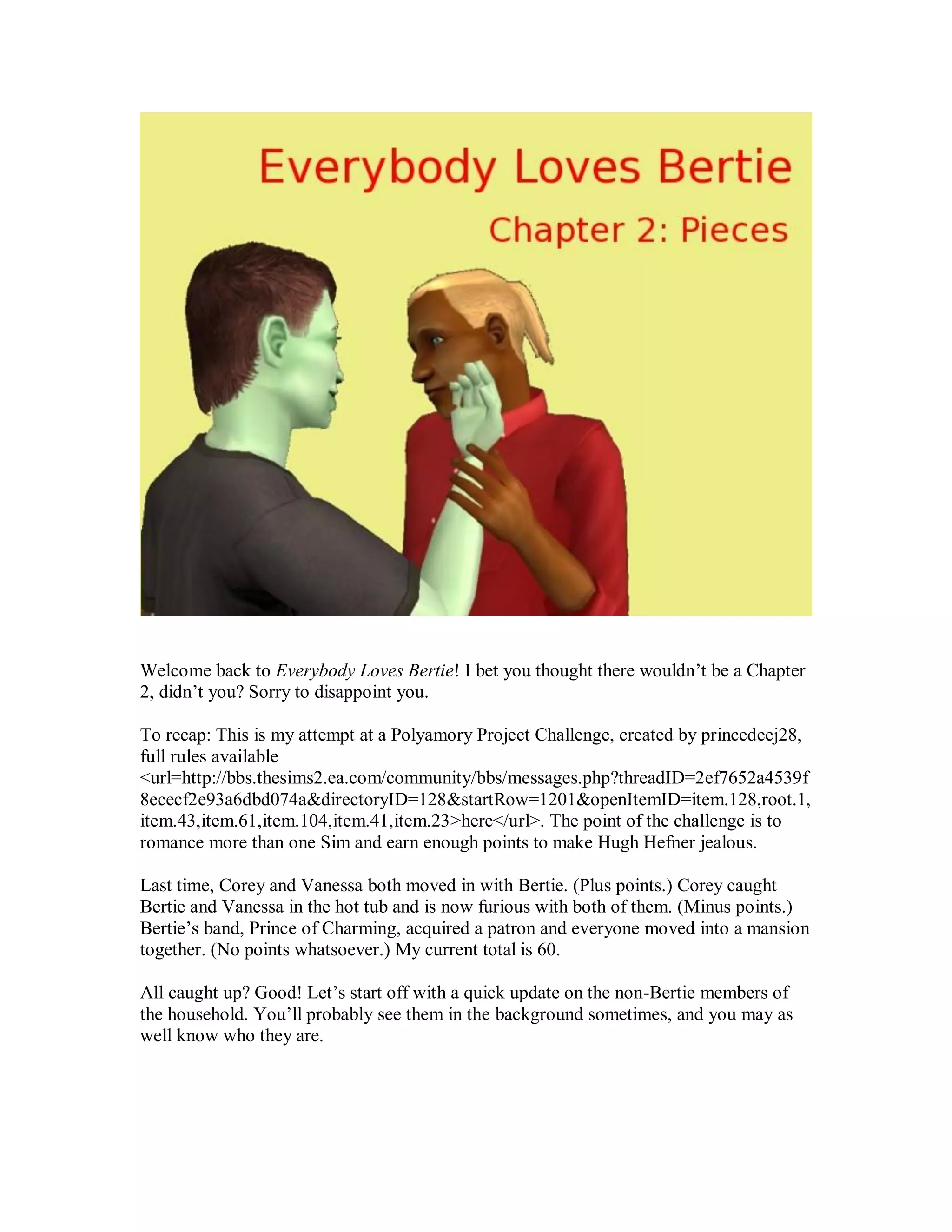 Bertie proposes marriage to Corey in an attempt to prove he is special. Corey agrees on the condition of a prenuptial agreement capping the number of lovers Bertie can have at four. Meanwhile, Bertie woohoos with Vanessa while Zenon is present. Bertie later woohoos with another lover, Robert Steele, earning points in the polyamory challenge. The chapter ends with the possibility of twins being born to one of the household members.