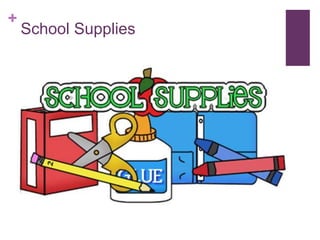 This document is a lesson that introduces common school supplies by asking "What is it?" and providing the answer for each item. It lists basic supplies like pens, pencils, erasers, rulers, and notebooks, as well as classroom furniture like desks, chairs, doors, and windows. It also includes bonus words for some additional supplies like crayons, glue, pencil sharpeners, scissors, and paints.
