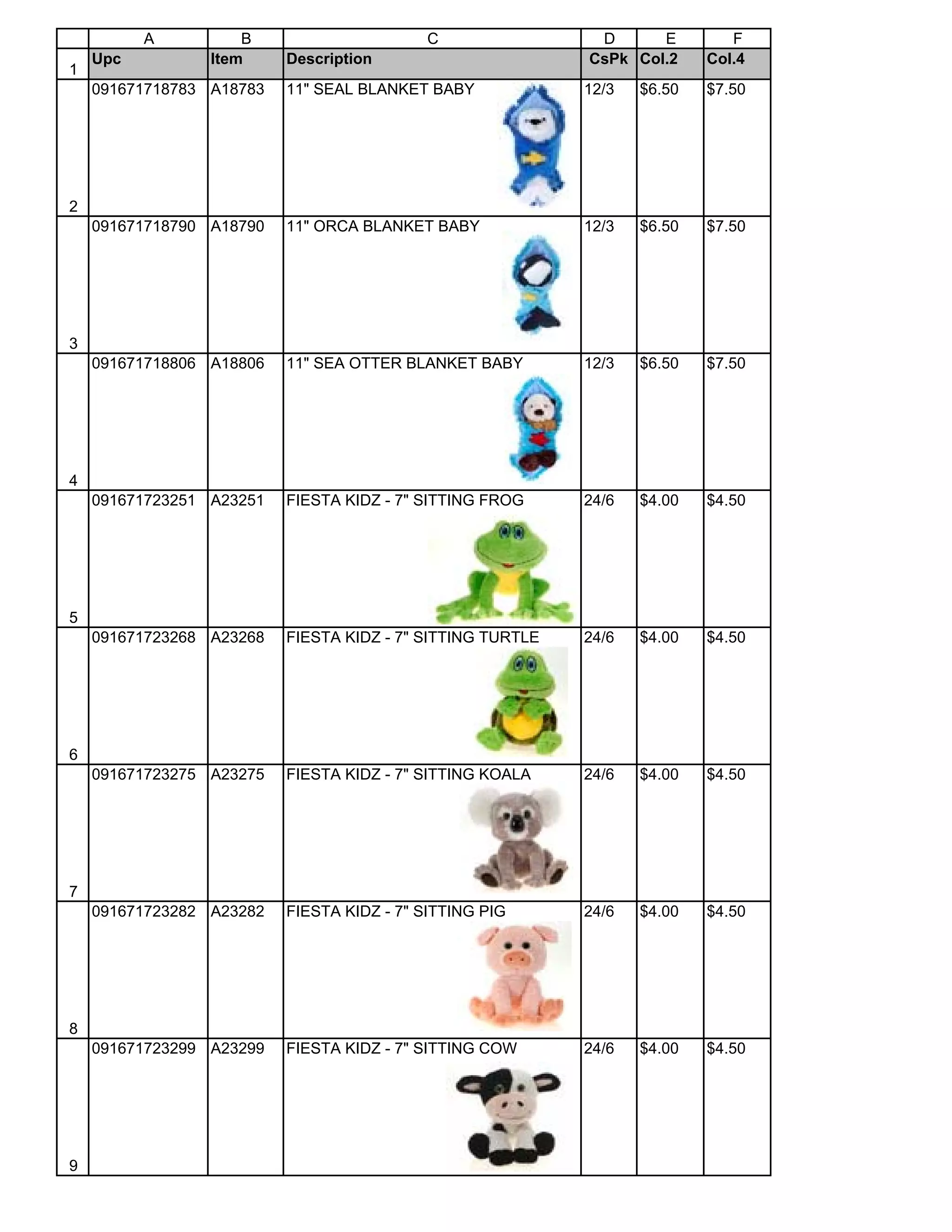 The document appears to be a product listing or catalog containing 72 entries describing various plush toys and accessories. Each entry includes the product code, name, description, packaging details, wholesale price and retail price. The items listed include blankets, toys featuring animals such as frogs, turtles and bears, backpacks and bean bag chairs. The document provides specifications and pricing for a variety of stuffed animal and toy products.