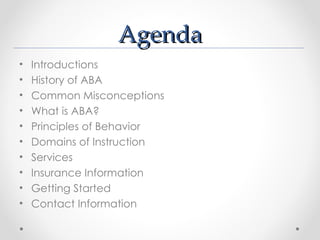 This document summarizes an ABA meeting that covered: introductions of presenters, a brief history of ABA, common misconceptions about ABA, definitions and principles of ABA, core domains of ABA instruction, ABA services provided by Everyday ABA including insurance information, and contact details.