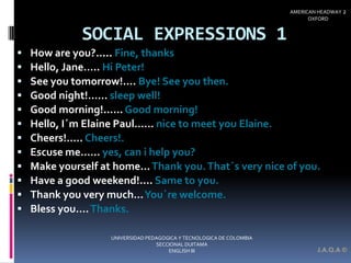 The document is a collection of conversational expressions and phrases for everyday English, including greetings, making conversation, and discussing feelings and experiences. It provides examples of dialogues, vocabulary for shopping, directions, and expressing various emotions or health concerns. Additionally, it includes practice exercises for dates and time expressions in American and British English.