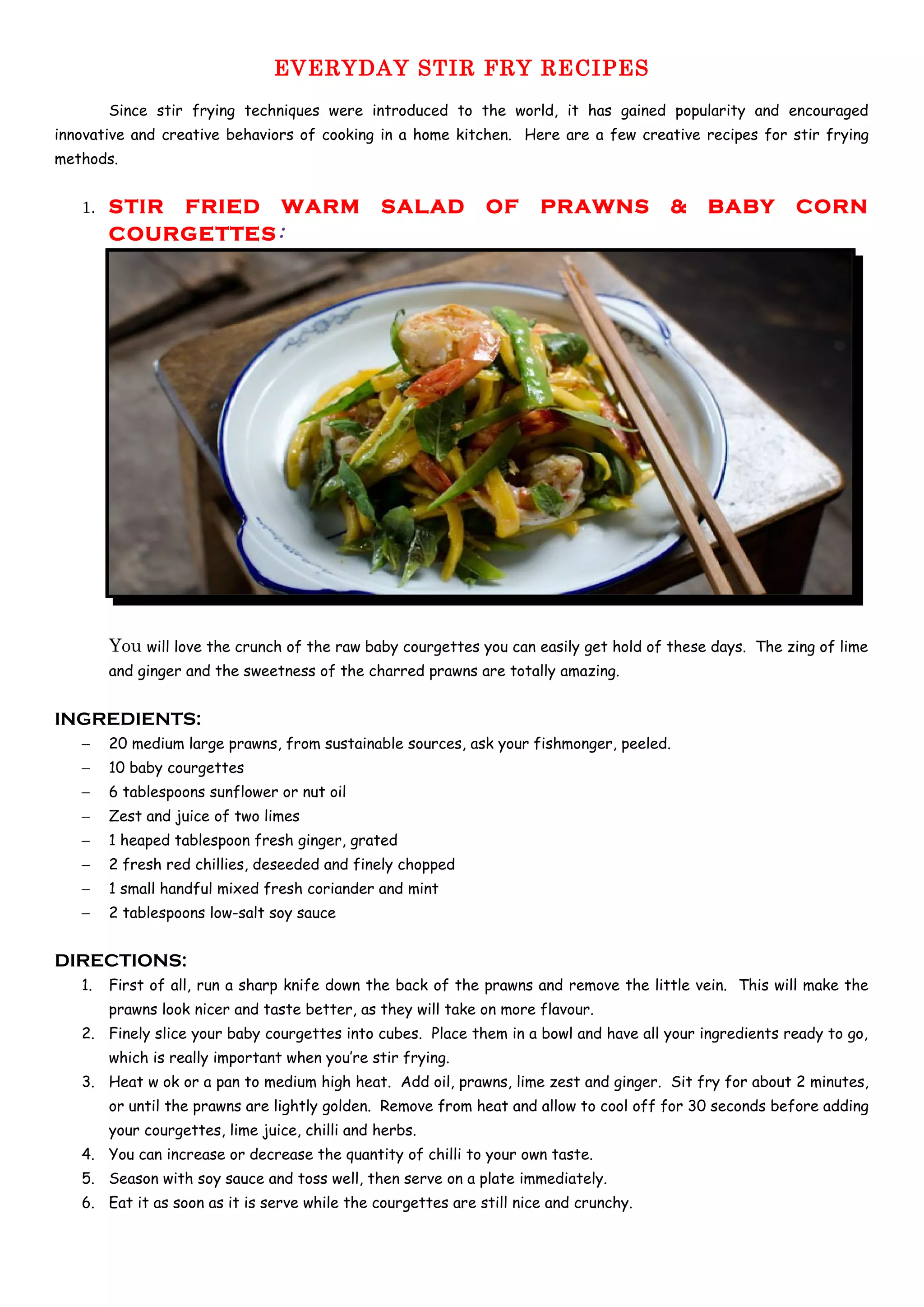 The document provides two recipes for stir fries: 1) A warm salad of prawns and baby courgettes with lime, ginger, and chili. 2) A stir fry of assorted vegetables including garlic, onion, cabbage, and mushrooms cooked with soy sauce and sesame oil. Both recipes emphasize the importance of not overcrowding the wok to ensure vegetables are fried rather than sweated. The document encourages creative experimentation with stir fry techniques and ingredients.