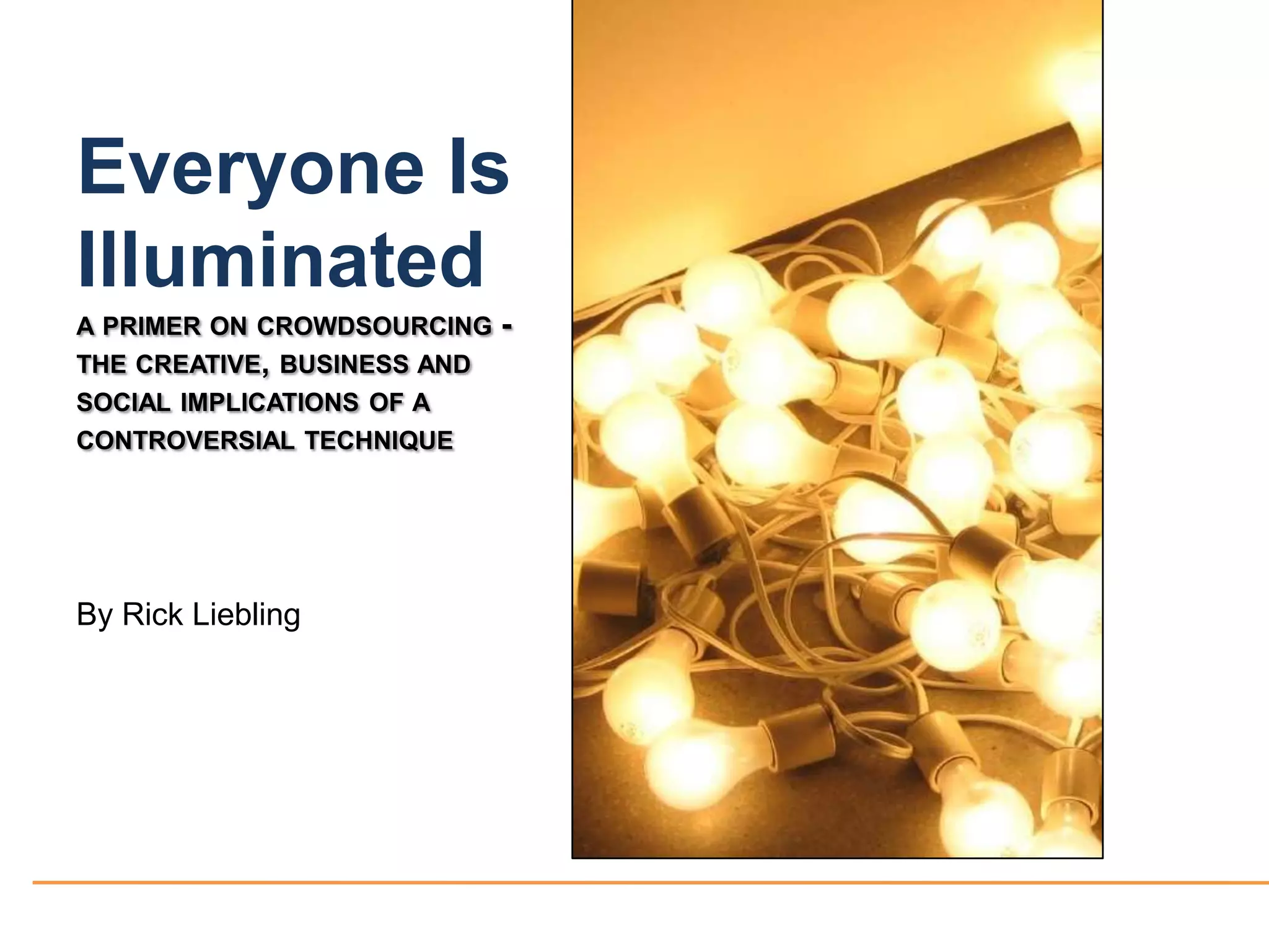 This document provides a primer on crowdsourcing and discusses its implications for creative industries and marketing. It includes perspectives from industry leaders on both the opportunities and challenges of crowdsourcing. Some key points made include: